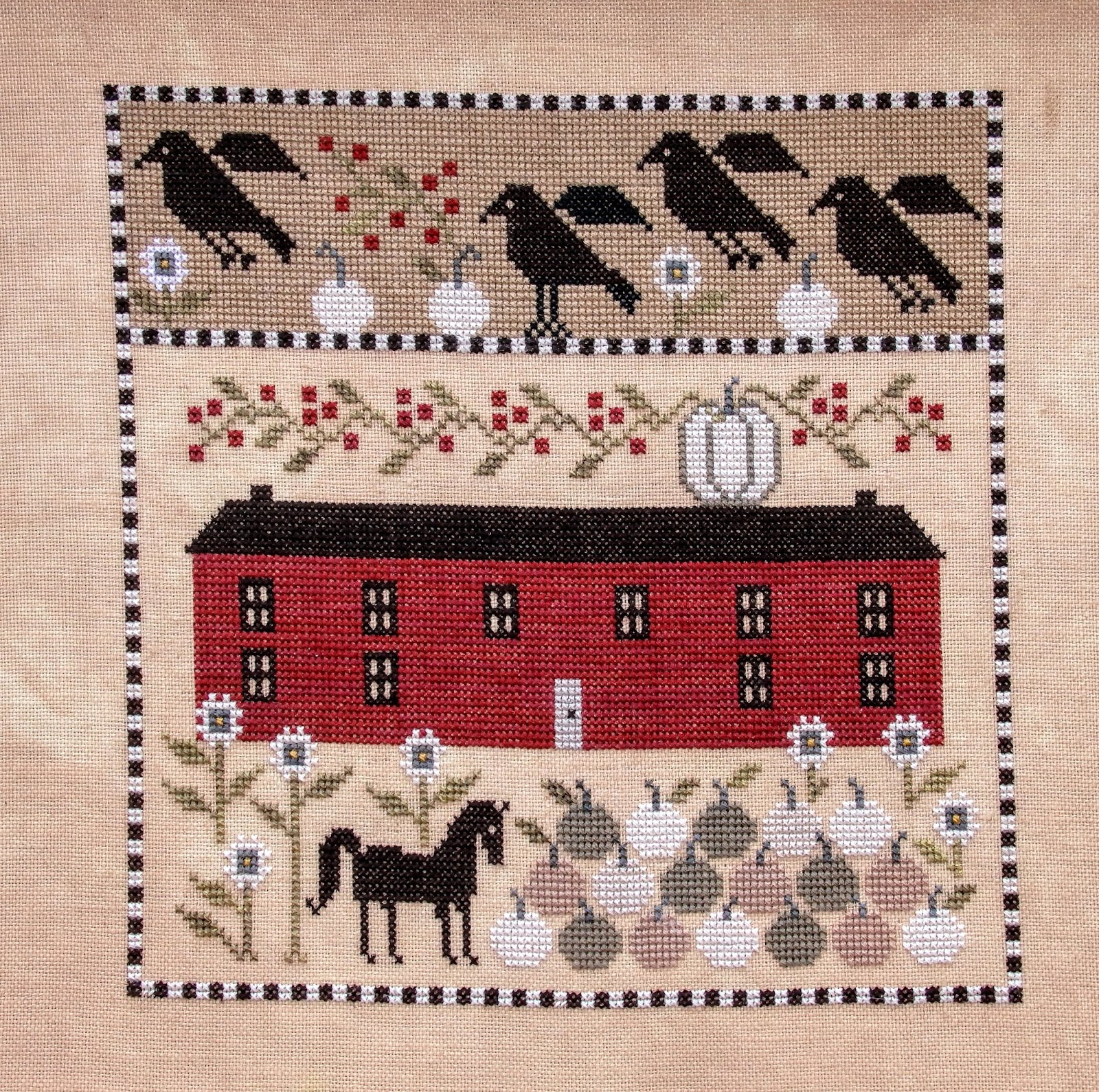 I Finally finished up my White Pumpkin Farm by Plum Street Samplers! I really enjoyed every stitch! I love red houses and birds too. I stitched this on Lakeside Linens 40 ct Vintage Sand Dune with DMC threads.