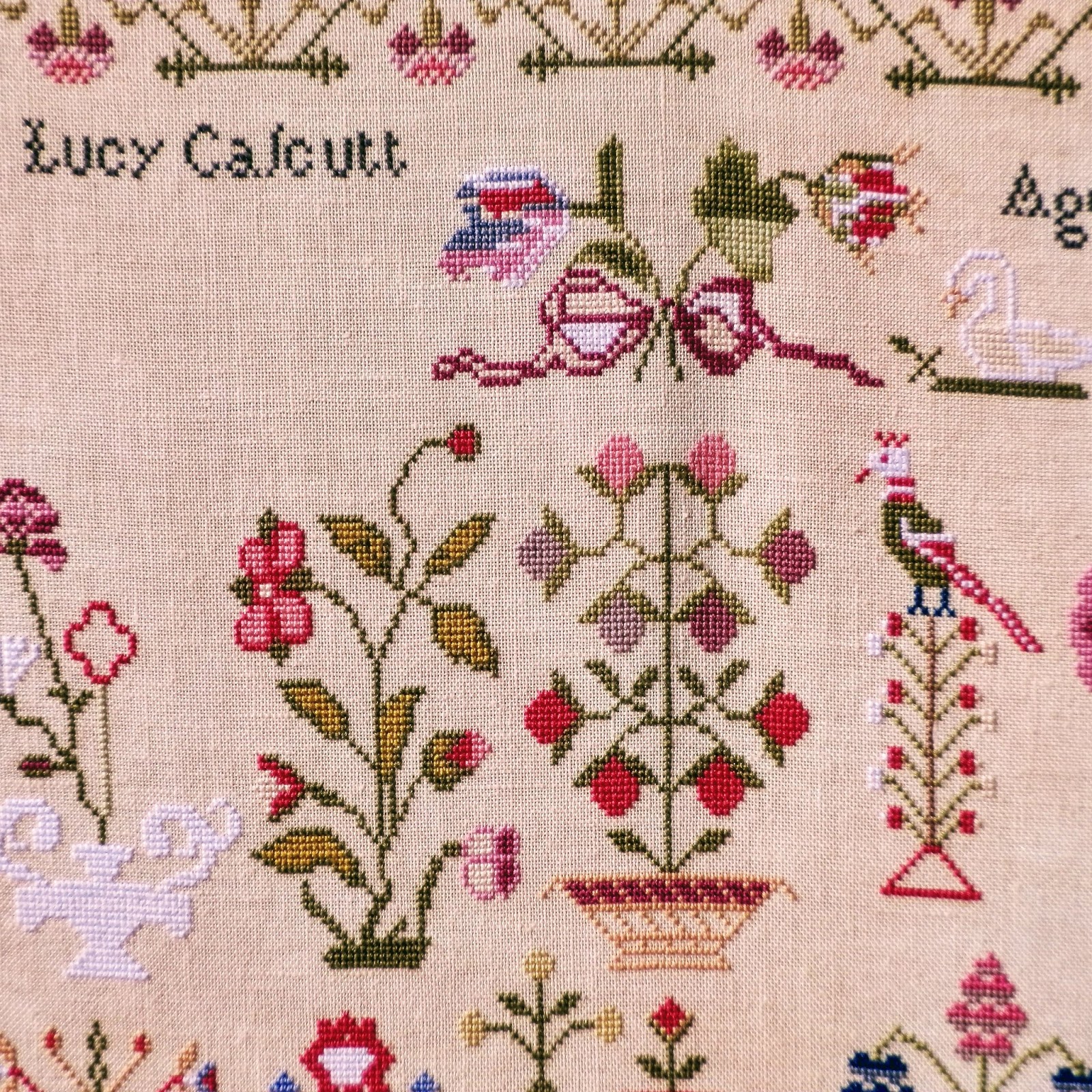 Row 1 is completed and time to roll up the fabric to start row 2. This is such a wonderful project by Just Stitching Along. Stitched on 40 ct Vintage Buttercream by Lakeside Linens.